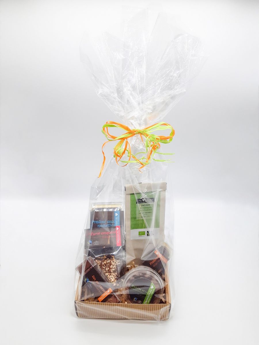 (Dés au cacao 50g; tablette de chocolat praliné noir; sachet de carrés croquants 50g; raisins secs enrobés de chocolat au lait 80g; ballotin 3 pralines; sachet de thé vert Senteurs Acidulées bio et Fairtrade 90g)