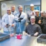 Dominique Rizzi, Renato Favaro, Arnaud Magnier, Cyril Molard, Alain Pierron, Fabrice Salvador à la rencontre des travailleurs des Chocolats du Coeur.